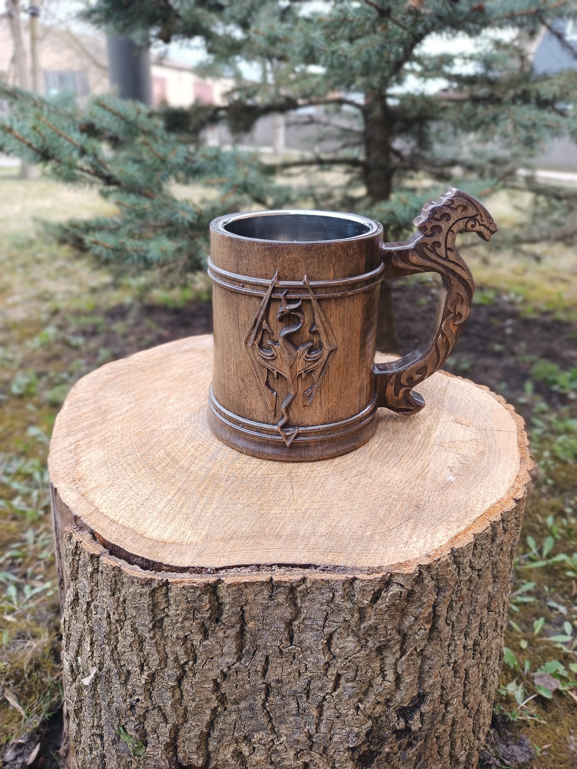 Wooden beer mug inspired by the game Skyrim. Each mug is unique, featuring a stainless steel insert for easy maintenance. The perfect choice for game fans, collectors, and lovers of atmospheric accessories. Personalization available with laser engraving on the bottom.